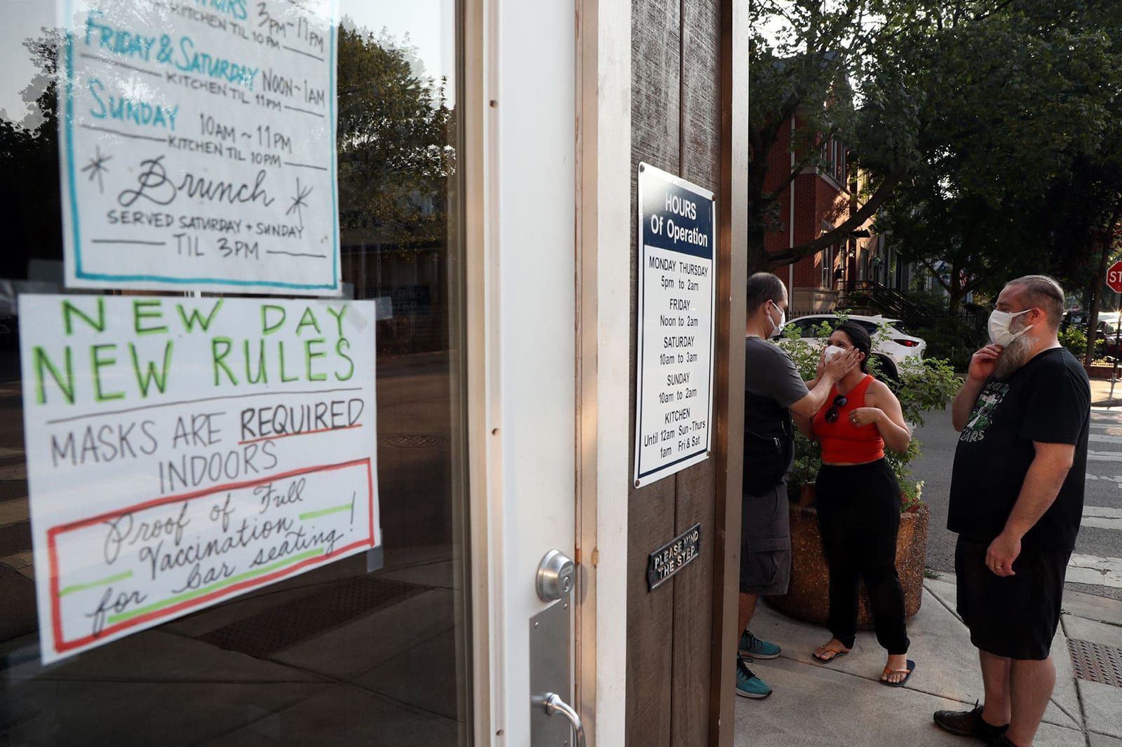 A sign at the entrance to Four Moon Tavern in Chicago notifies customers that face masks are required for entry and proof of COVID vaccination is required for anyone who wants to sit at the bar on July 29, 2021. - Terrence Antonio James/TNS
