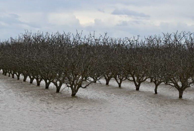 Flooded Central Valley farmland along the Tule River in Tulare County during a winter storm near Corcoran, California on March 21, 2023