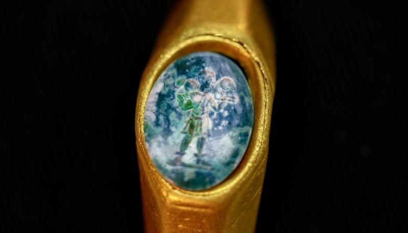 The ring was found among a trove of third-century Roman coins, as well as a bronze eagle figurine, bells to ward off evil spirits, pottery, and a Roman pantomimus figurine in a comic mask, the Israel Antiquities Authority said in a statement.