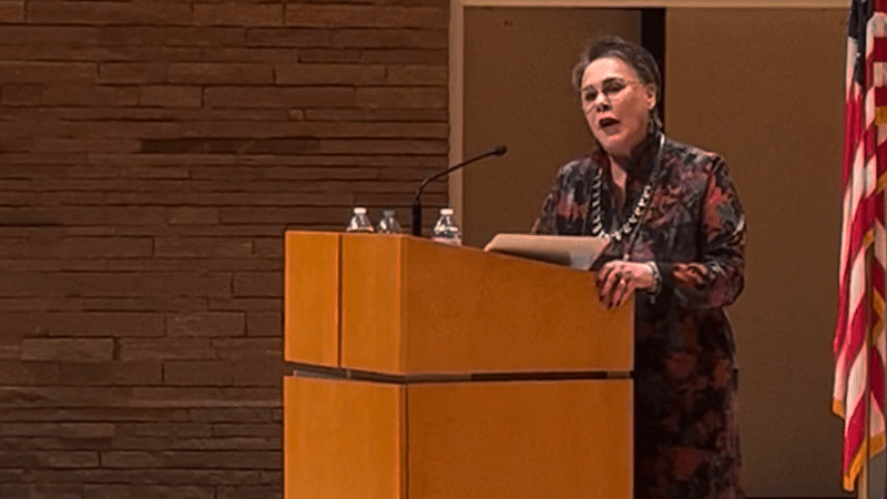 The student then walked out of the Wheeler Concert Hall to applause, and student Allyse Taylor then pressed the lawmaker whether she's concerned about alleged constitutional violations by the Trump administration and federal agents, such as a recent Department of Homeland Security directive authorizing officers to enter homes without judicial warrants.
