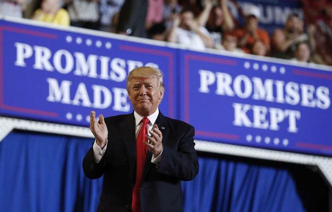 Trump campaign signs reading “Promises Made, Promises Kept” at a rally, photo by White House social media director Dan Scavino (Twitter)