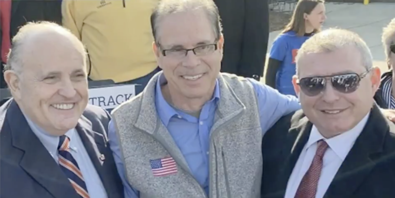 "Here’s a nice shot of the latest @GOP senator/juror—Mike Braun of Indiana—afraid to call Lev Parnas as a witness at the impeachment trial, posing with, of course, Lev Parnas and @RudyGiuliani," Bondy tweeted.