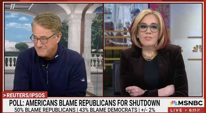 Speaking with “Morning Joe” regular Molly Jong-Fast, Scarborough cited the poll that shows 50 percent of voters blame Republicans for the government shutdown, with 43 percent blaming Democrats.