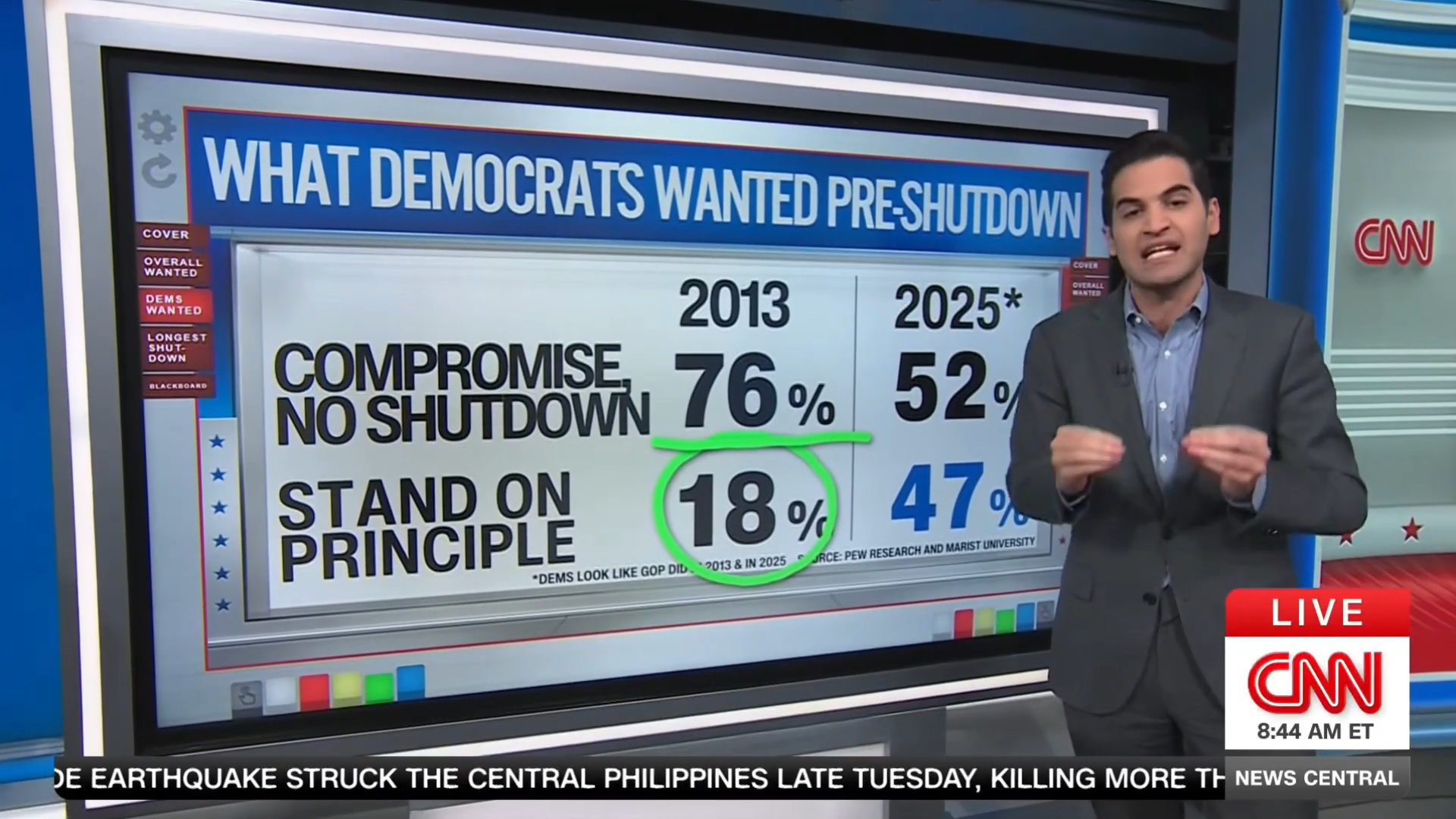 “Come to [2025], we see an even split; 50% of Americans say they want a compromise, no shutdown, but up like a rocket, we see now 49% of Americans either wanting a shutdown, or saying they want their side to stand on principle.”