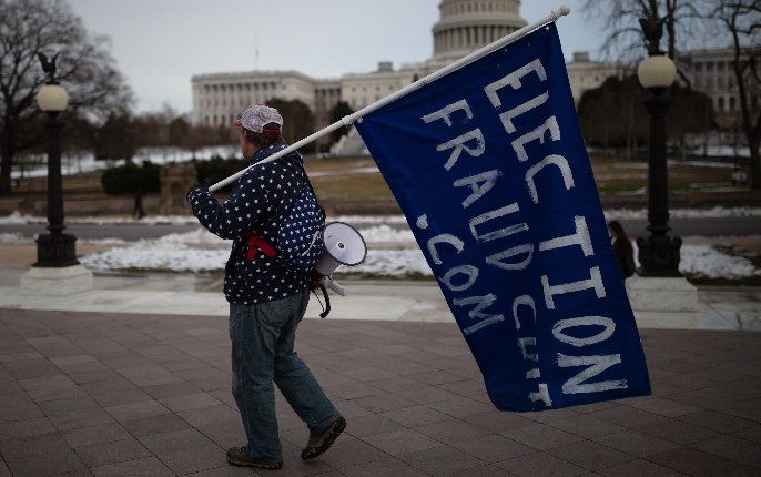 A man with an election fraud flag walks through Washington, D.C. (Shutterstock)