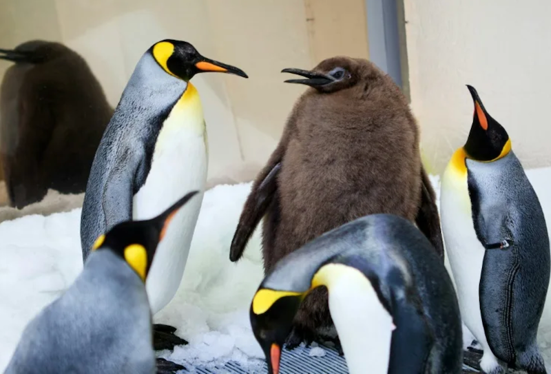 Pesto the penguin towers over the colony at his Australian aquarium home, a fluffy brown furball impossible to miss as he waddles across the ice.