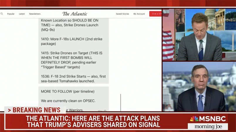 During an appearance on "Morning Joe," Warner was on hand when news broke that The Atlantic editor-in-chief Jeffrey Goldberg had published a collection of screenshots showing Defense Secretary Pete Hegseth sharing an extraordinarily detailed play-by-play on how the attack on the Houthi rebels would proceed just moments before the assault.