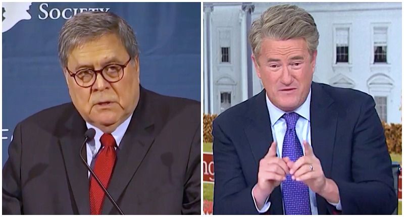 MSNBC's Joe Scarborough condemned Attorney General William Barr's "disgraceful" speech before the conservative Federal Society.