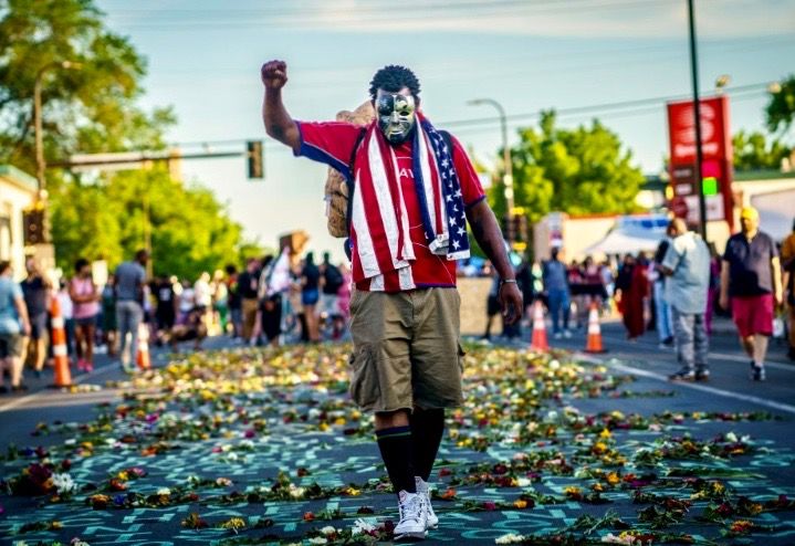 A man raises his fist during a memorial for George Floyd (Kerem Yucel:AFP)