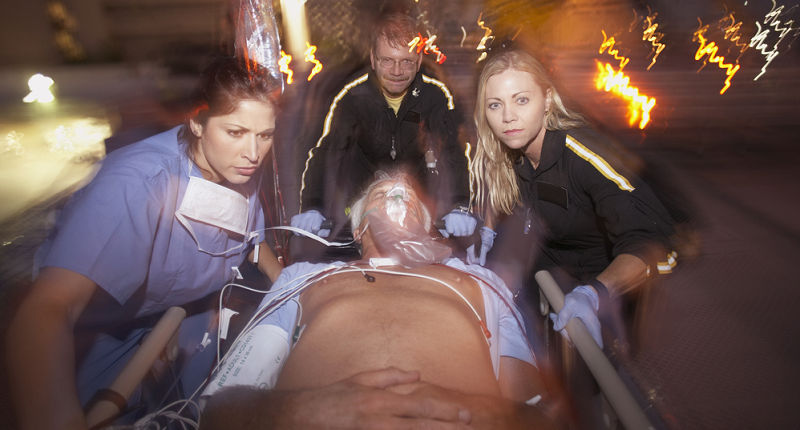 Emergency personnel wheel man on gurney (Shuttershock)