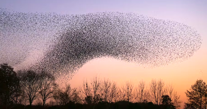 Starling murmurations form as daylight fades over their roosting sites. Shutterstock / Albert Beukhof