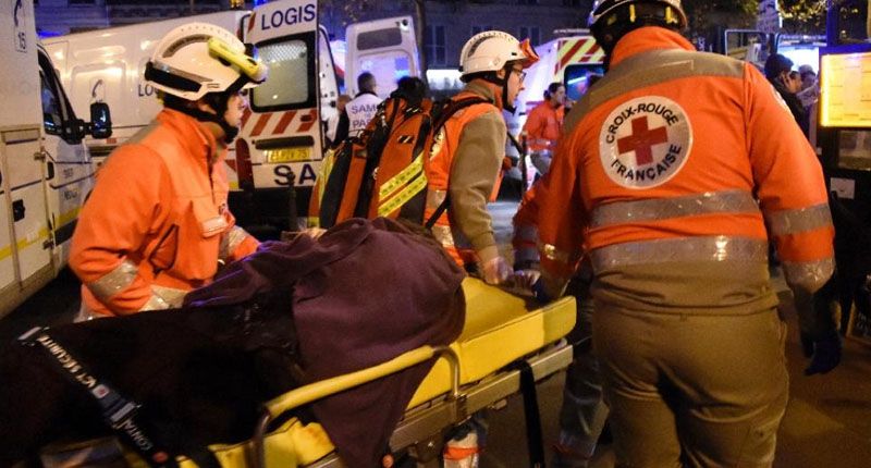 Rescue workers evacuate an injured person near the Bataclan concert hall in central Paris, on November 13, 2015 (AFP Photo/Dominique Faget)