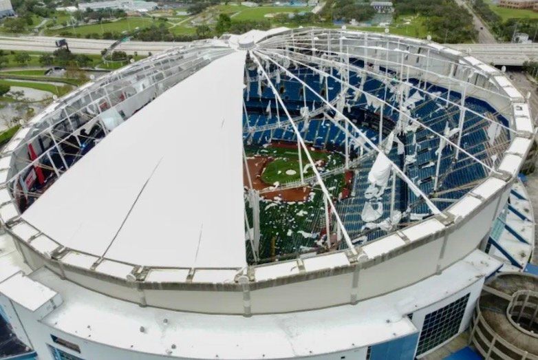 Photos from AFP showed the once-covered Tropicana Field in St. Petersburg exposed to the elements the next day, the fiberglass roofing largely destroyed, metal rafters left naked in the morning sunlight.