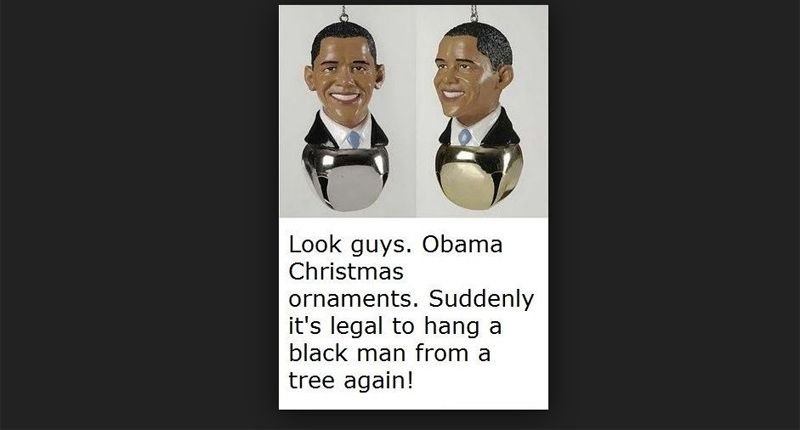 Officer Collin Visser posted the photo of Christmas tree ornaments with the president’s likeness, writing: “Look guys. Obama Christmas ornaments. Suddenly it’s legal to hang a black man from a tree again!”