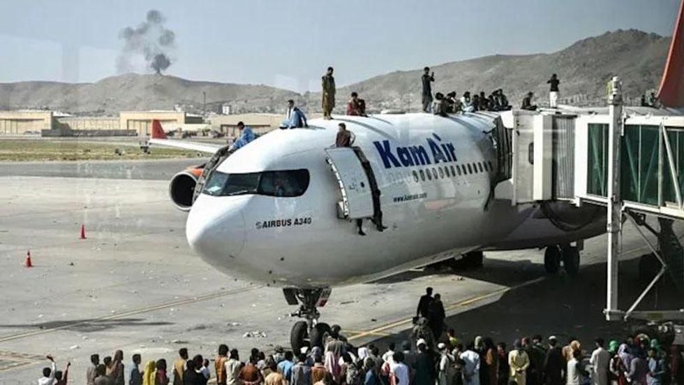 Afghan people climb atop a plane as they wait at the Kabul airport hoping to leave the country. (AFP)