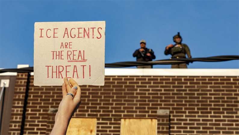 A protester holds up a sign as federal agents stand guard on top of the Broadview ICE detention facility, after U.S. President Donald Trump ordered increased federal law enforcement presence to assist in crime prevention, in Broadview, Illinois, U.S. September 19, 2025. REUTERS/Jim Vondruska