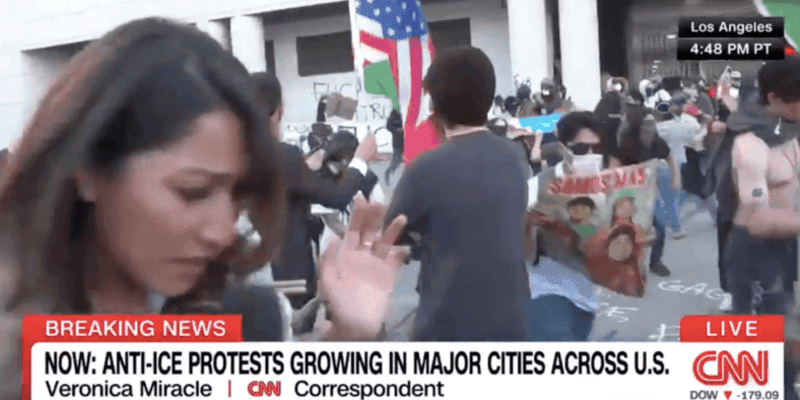 A chaotic scene unfolded Friday live on CNN as anti-ICE protests escalated in downtown Los Angeles, where reporter Veronica Miracle visibly struggled on camera.