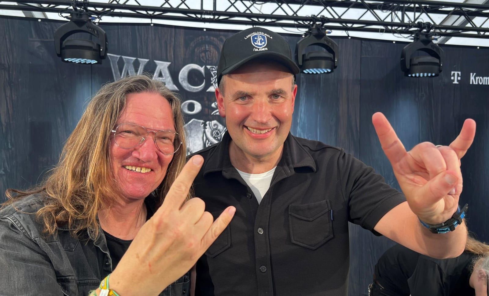 Festival co-founder Thomas Jensen (L) and Gudni Johannesson, president of Iceland, pose at the Wacken Open-Air Festival (WOA). André Klohn/dpa