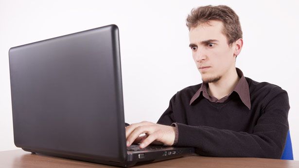 [Young man with angry face using a laptop on Shutterstock]