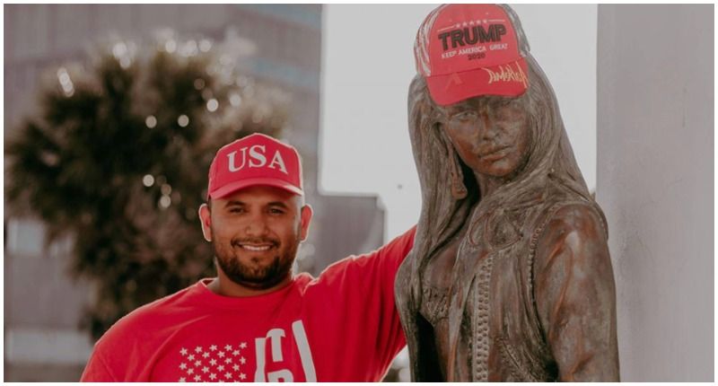 Joe Michael Perez owns a Trump memorabilia shop in Texas's Corpus Christi Trade Center, and took an opportunity to promote his business in a local bilingual newspaper -- with a photo of himself by a statue of deceased Tejano singer Selena wearing a Trump "Keep America Great" hat, The Houston Chronicle reports.
