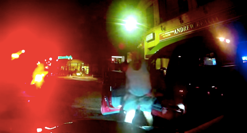 A camera mounted on the driver's dashboard captures the confrontation, which begins when a pickup truck pulls alongside the motorist and the off-duty officer jumps out.