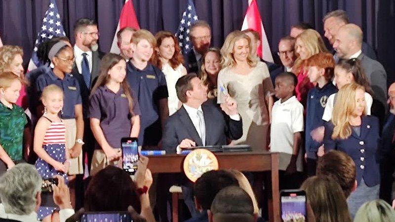 Gov. Ron DeSantis at a bill signing ceremony at Cambridge Christian School in Tampa on May 17, 2023 (photo credit: Mitch Perry)