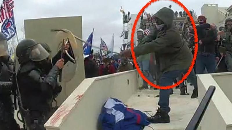 Capitol attacker Mark Ponder swings pole at police officers (Photo: FBI indictment/SeditionTracker)