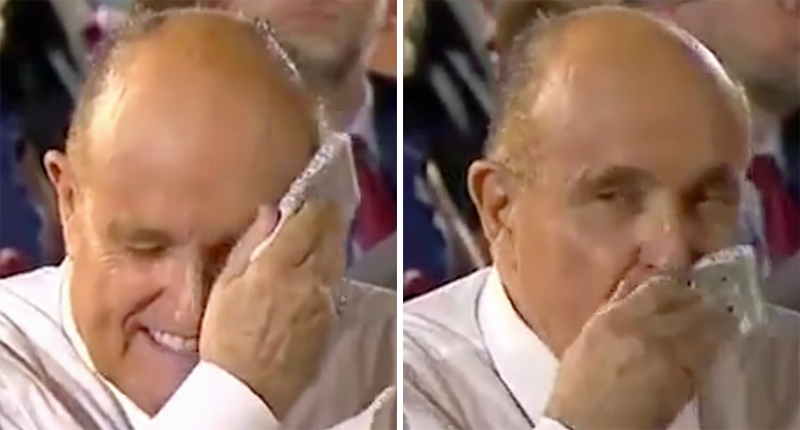 On Thursday, during the final evening of the Republican National Convention, President Donald Trump's associate Rudy Giuliani — who was sitting in attendance on the South Lawn — was caught on camera wiping sweat from his brow, and rubbing it on the woman sitting next to him.