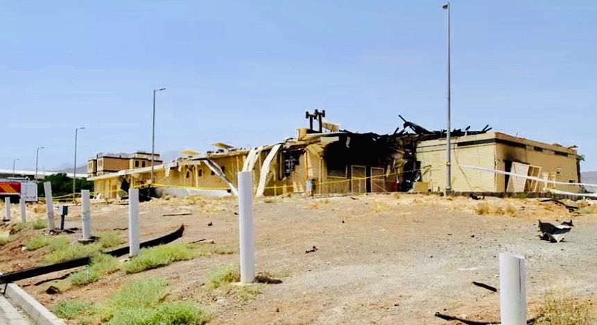 The Iranian Atomic Energy Organisation released a photo purportedly from the site, showing a one-storey building with a damaged roof, walls apparently blackened by fire and doors hanging off their hinges as if blown out from the inside.