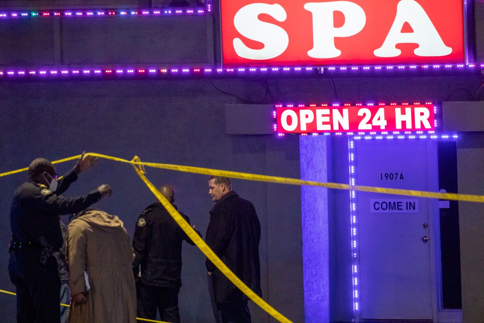 Atlanta police officers and detectives respond to the crime scene at Aromatherapy Spa and Gold Spa, both located in the 1900 block of Piedmont Road NE in Atlanta, Tuesday, March 16, 2021. - Alyssa Pointer / Alyssa.Pointer@ajc.com/TNS