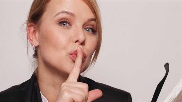'Businesswoman making hush gesture' [Shutterstock] https://tinyurl.com/qb78ke6