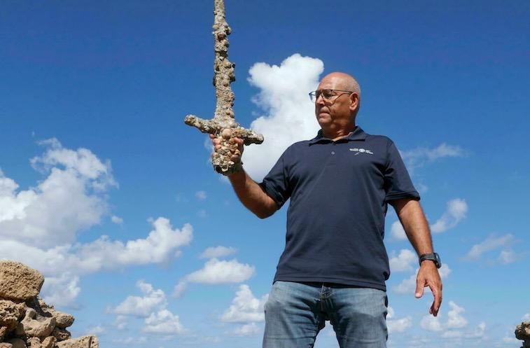 The Israel Antiquities Authority said diver Shlomi Katzin came across the iron sword, now encrusted in marine organisms, after shifts in the sand left it exposed.