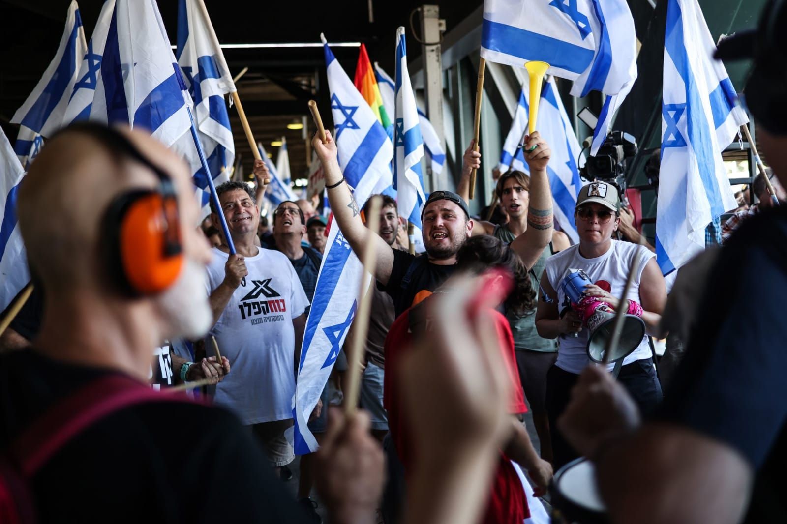 Israeli protesters block a train station in Tel Aviv during a protest against the Israeli government. Ilia Yefimovich/dpa