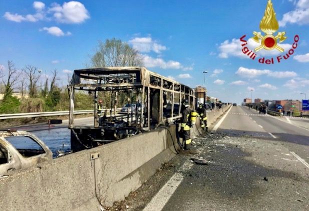Photos showed the burnt-out shell of the bus and the car, which were travelling on a road near Milan.