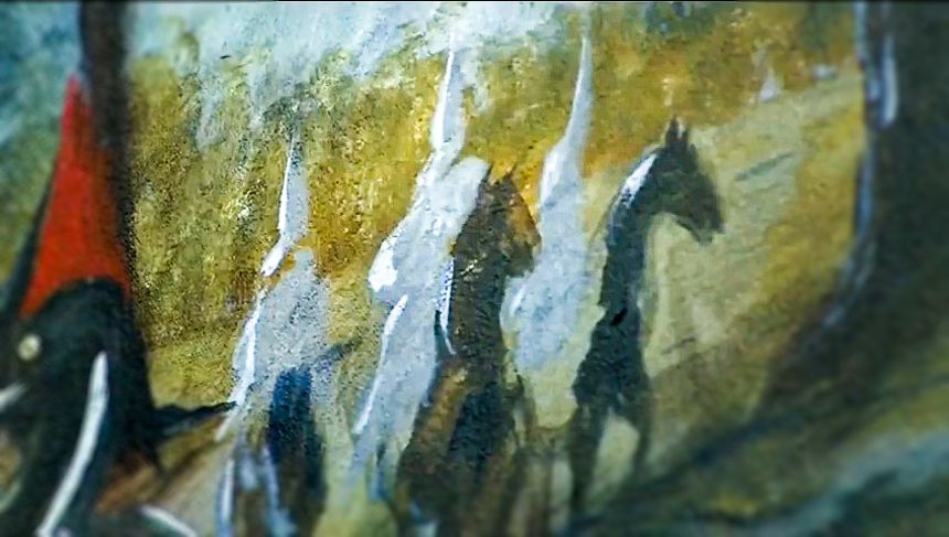 The mural, which greets visitors as they enter the courthouse, features a small vignette with three hooded Klansmen riding horses. Although Eugene Barber, who painted the mural in 2001, has died, he left visitors a guidebook that offers a short explanation for the vignette:
