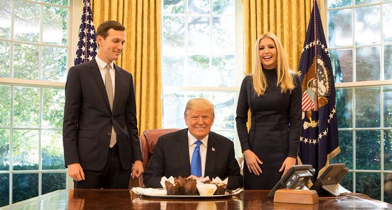 White House senior advisors Jared Kushner and Ivanka Trump stand behind the president in the Oval Office (Twitter)