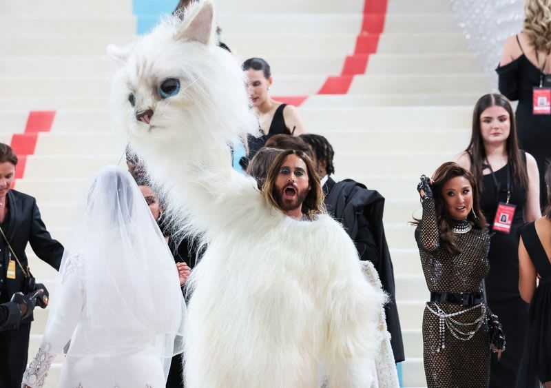 NEW YORK (Reuters) -An enormous fluffy, white, blue-eyed Burmese cat mascot ascended the Metropolitan Museum of Art steps on Monday in homage to Karl Lagerfeld’s beloved pet “Choupette,” who later revealed himself as actor Jared Leto, bringing a whole new meaning to this year’s Met Gala dress code “in honor of Karl.”