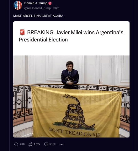 Donald Trump championed the win, posting on social media: "Congratulations to Javier Milei on a great race for President of Argentina. The whole world was watching! I am very proud of you. You will turn your Country around and truly Make Argentina Great Again!"