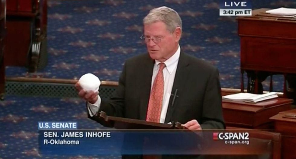 Sen. James Inhofe (R) using snowball on Senate floor to make point about climate change (Screenshot from C-SPAN)