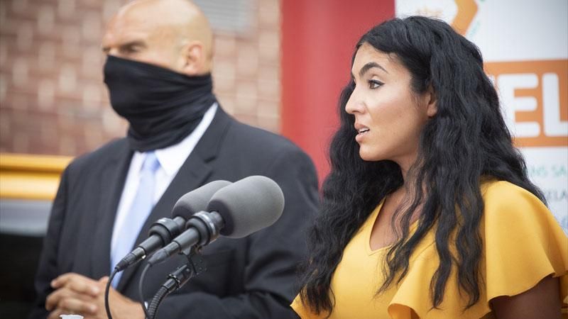 Gisele Fetterman speaking with the press outside of the York County YMCA. (Pennsylvania governor's office)