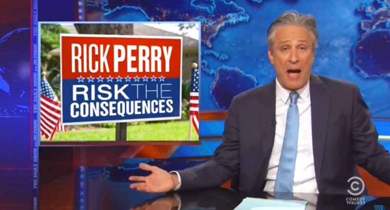 "'Risk the consequences,'" Stewart repeated while laughing. "Maybe the most accurate campaign slogan I've ever heard. 'Hi, I'm Rick Perry, let's see what happens.'"