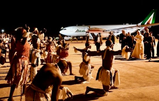 Touching down in Mozambique, Francis was welcomed by a military band and a display of traditional dance