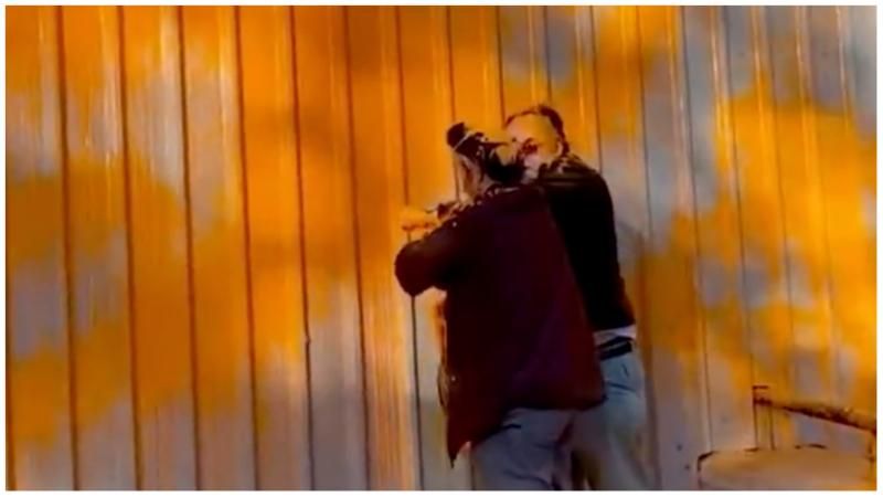 A video posted to Twitter shows the protester begin to spray the paint when a man walks up and wrestles the nozzle away, ultimately spraying the protester with his own paint.