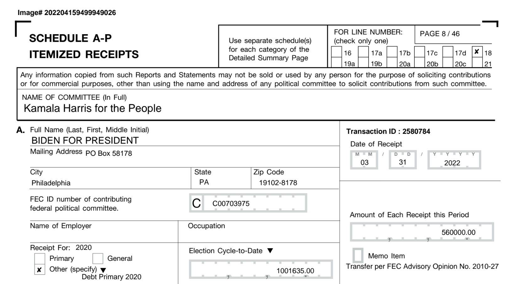 But the Biden campaign again came to the rescue, injecting another $560,000 into Kamala Harris for the People, to bring its grand debt-retirement total to more than $1 million.