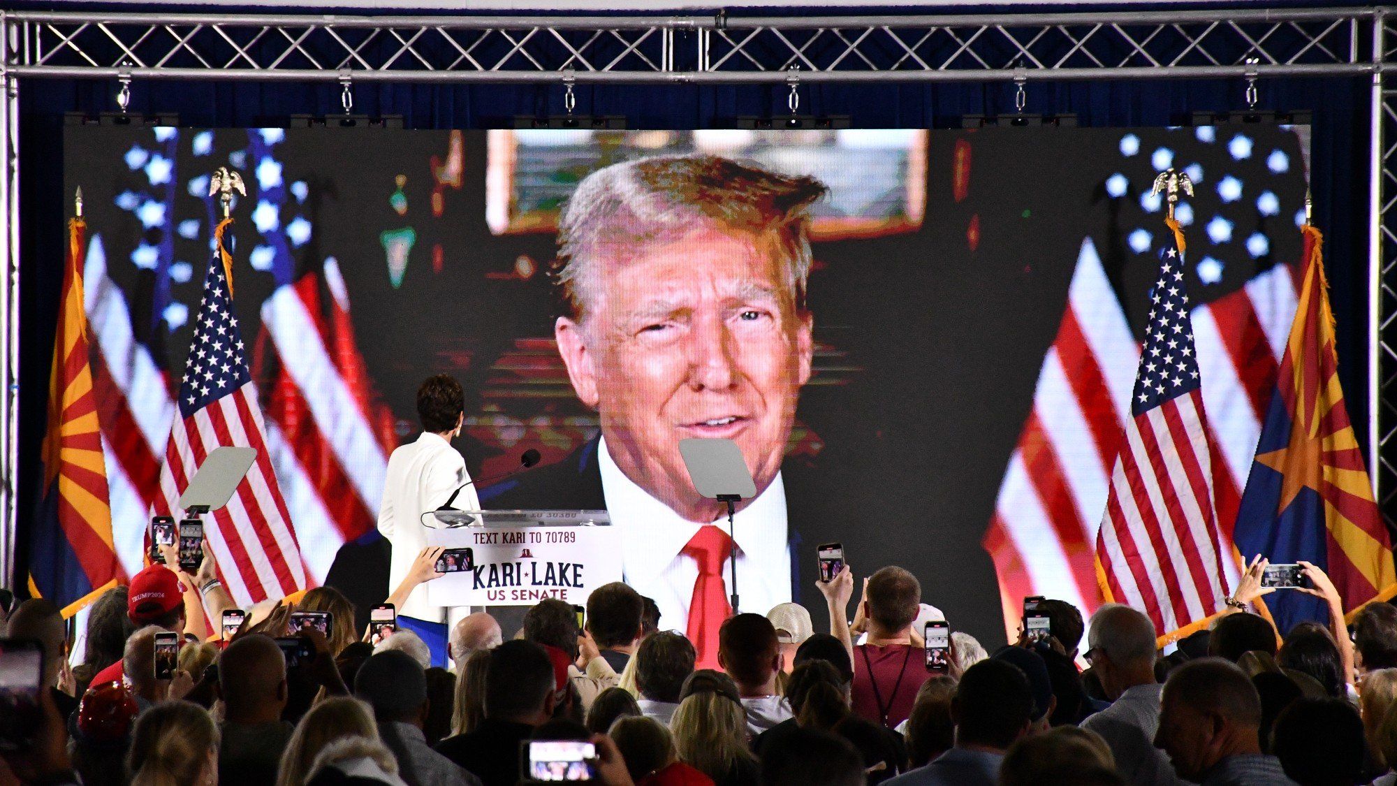 And Trump showed up virtually on Tuesday, appearing on the big screen behind Lake to give his official endorsement of her run for U.S. Senate.