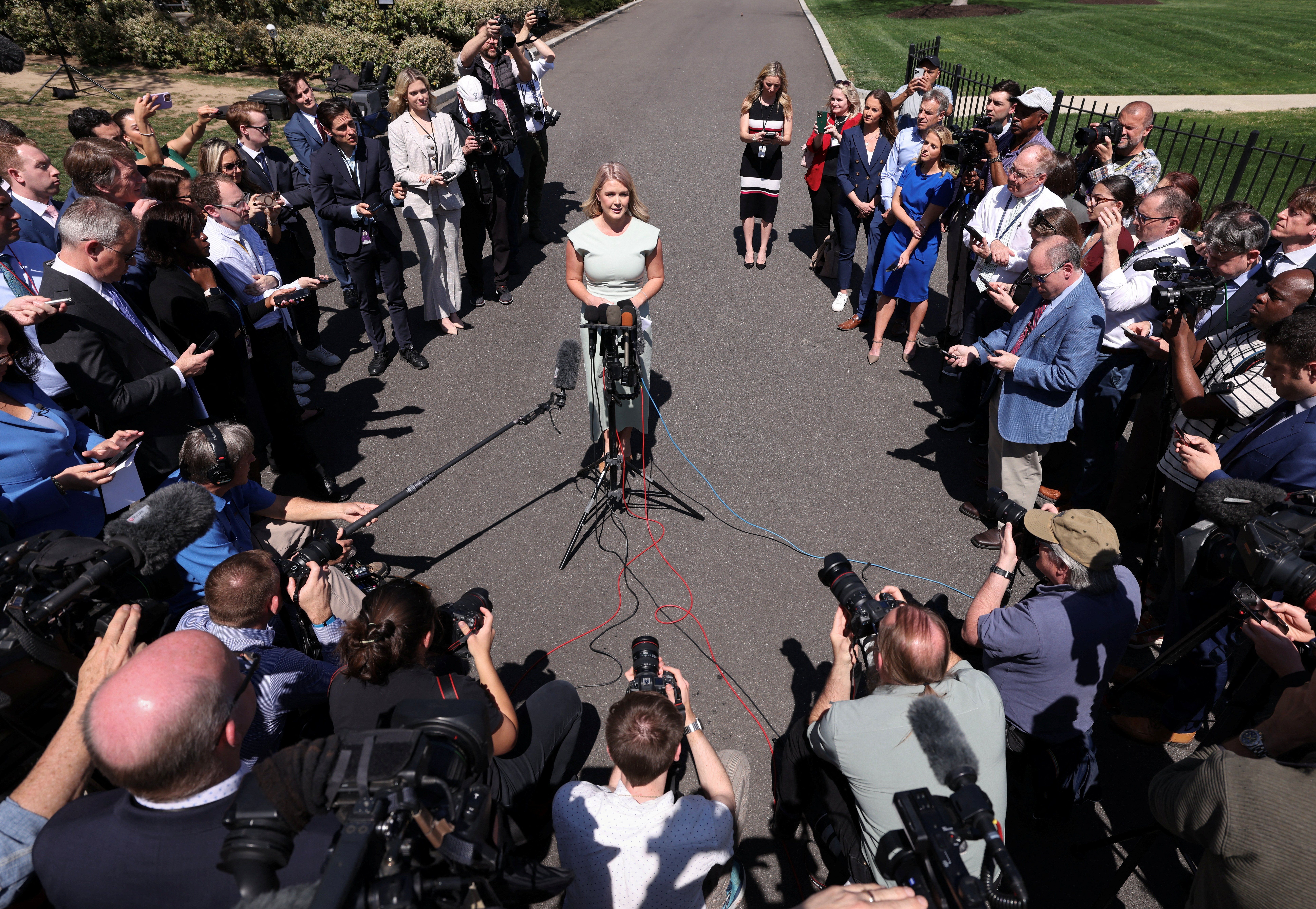 White House Press Secretary Karoline Leavitt speaks to reporters at the White House in Washington, D.C., U.S., March 31, 2025. REUTERS/Kevin Lamarque