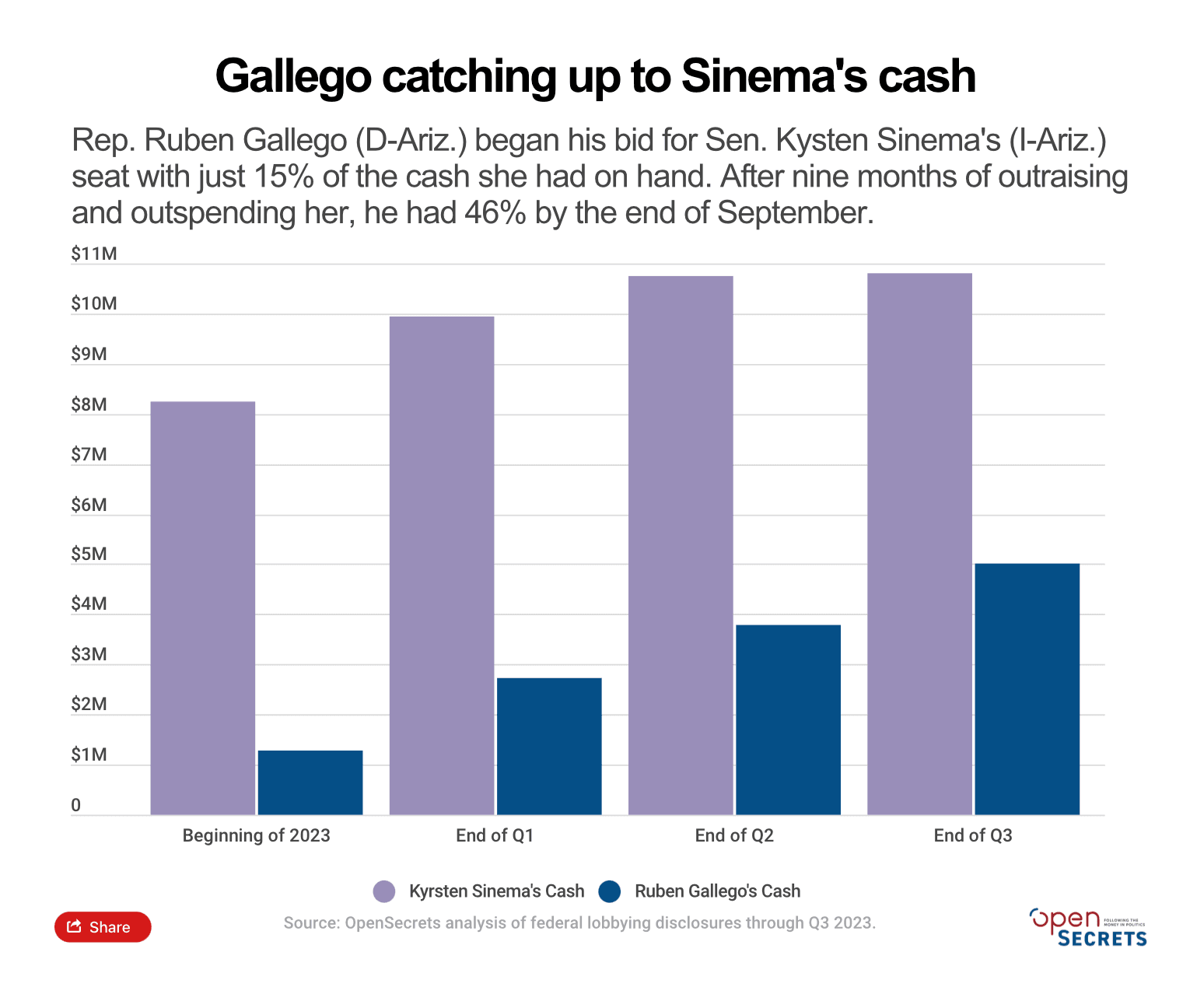 Gallego, a five-term congressman, has been outraising Sinema all year and continued that trend last quarter, according to an OpenSecrets analysis of campaign finance reports.