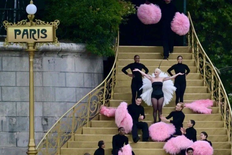 In a nod to her passion for French culture, US pop star Lady Gaga appeared from behind a fan of pom-poms held by her dancing troupe to sing "Mon truc en plumes" ("My Thing With Feathers"), an iconic French music hall hit by the legendary Zizi Jeanmaire.