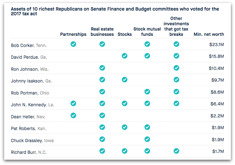 "The 10 richest Republicans in Congress in 2017 who voted for the tax bill held more than $731 million in assets, almost two-thirds of which were in stocks, bonds, mutual funds, and other instruments."