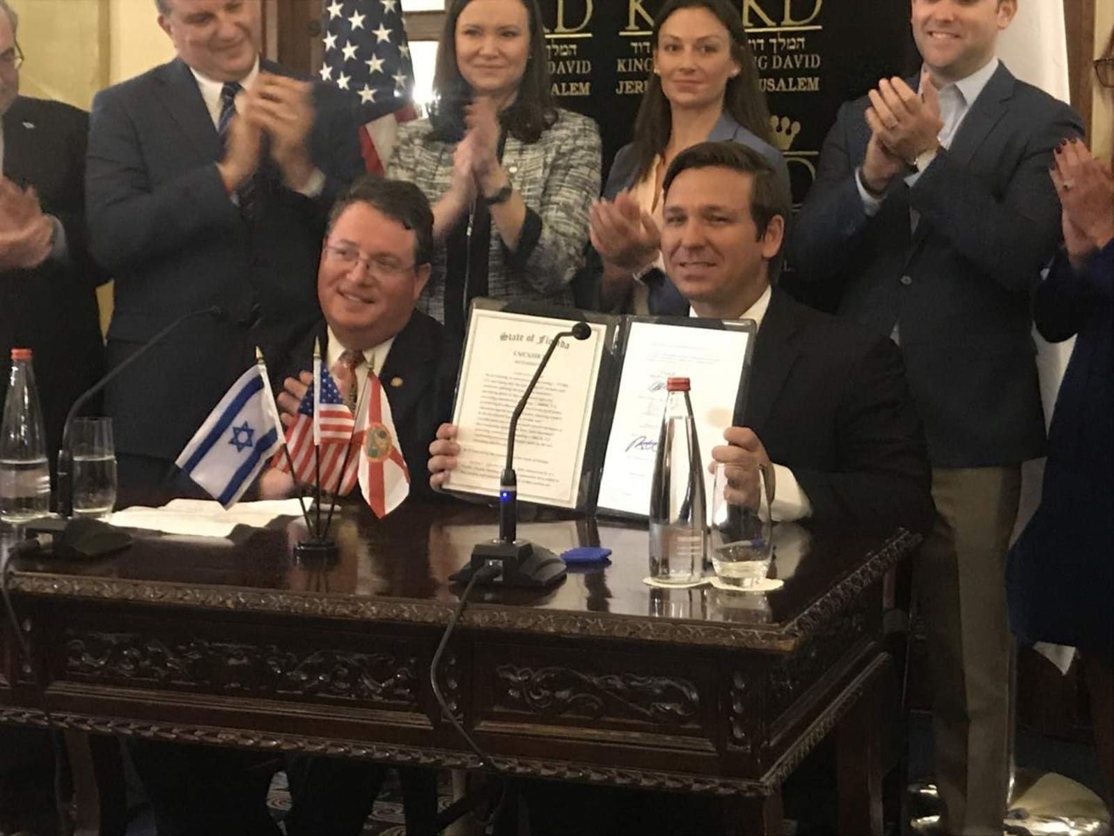 Ron DeSantis as others watch him sign a state antisemitism bill in in May 2019. - Jeffrey Schweers/Tampa Bay Times/TNS